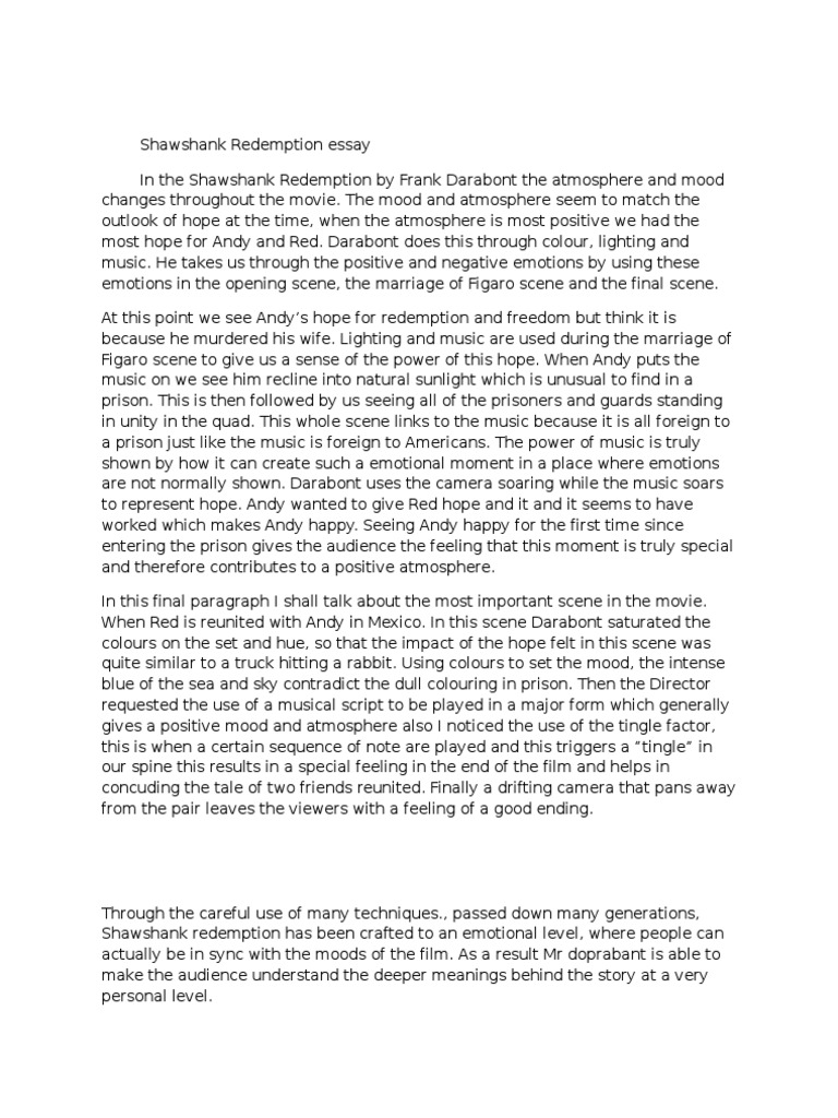 We use cookies to give you the best experience possible. Words:Paragraphs: 22, Pages: 8. Paper type: EssaySubject: Crime. This sample essay on Shawshank Redemption Essay provides important aspects of the issue and arguments for and against as well as the needed facts.